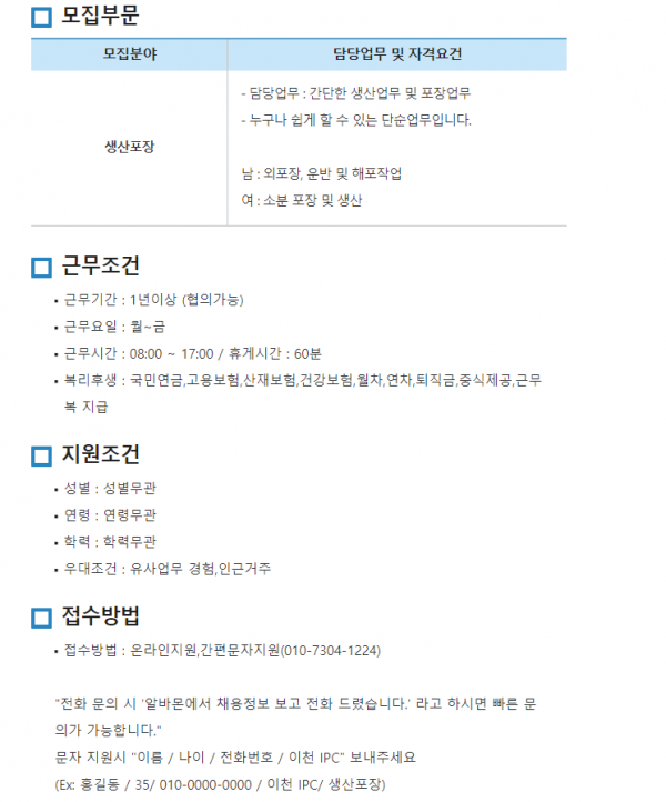 ◇ 모집분야 : - 단순포장/쉬운업무/통근차량운행/ 식...